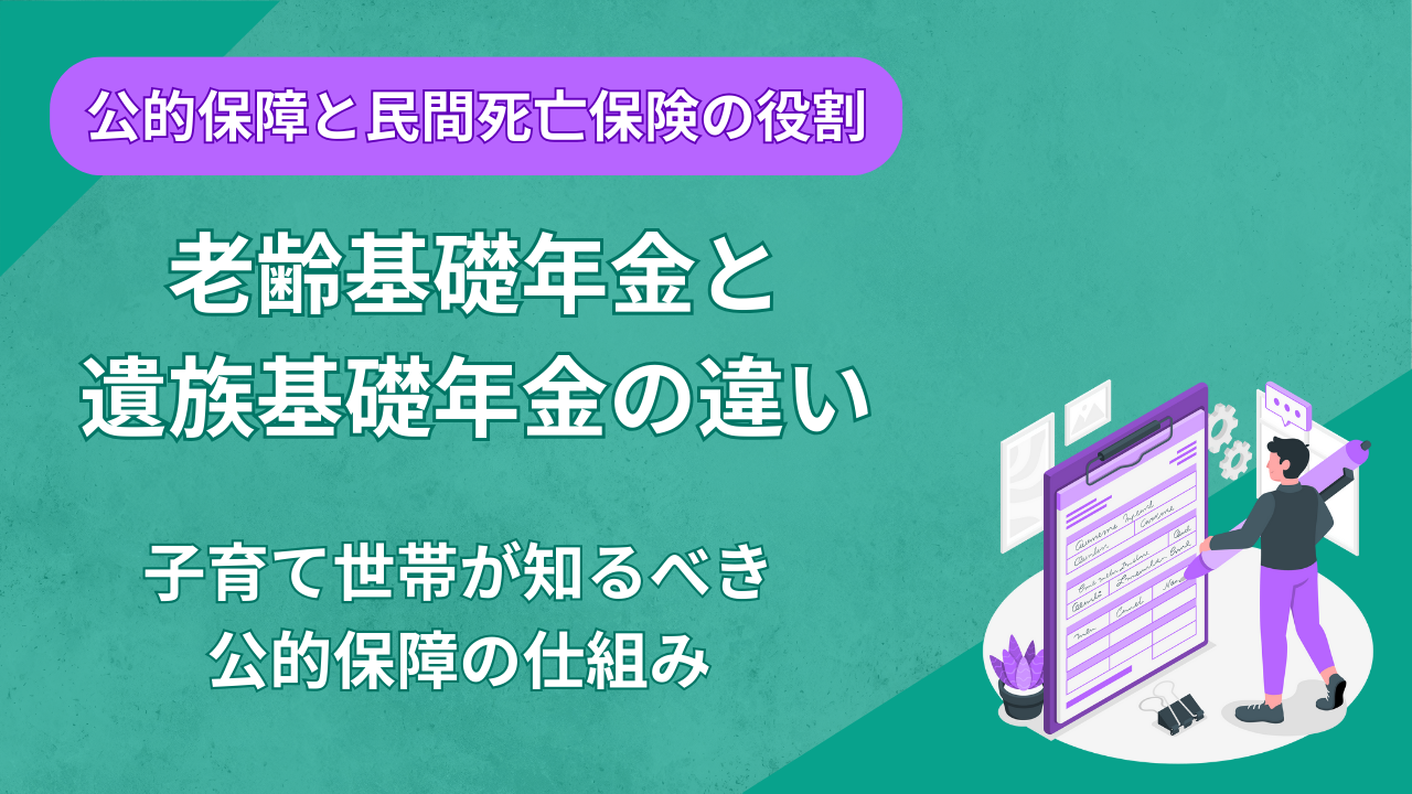 言葉は似ていますが、将来の老後資金となる「老齢基礎年金」と、万が一の生活費となる「遺族基礎年金」は、その目的も受給できる条件もまったく異なります。この違いをあいまいにしたままでは、本来必要のない民間保険に加入してしまったり、逆に保障が足りないことに気づけなかったりするリスクがあります。